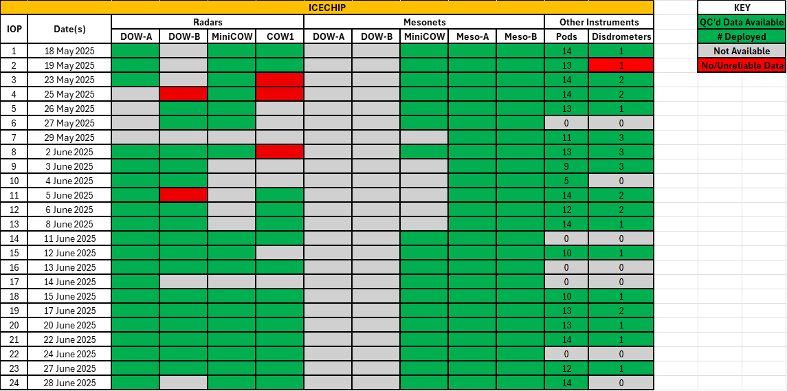 | ICECHIP | In-situ Collaborative Experiment for the Collection of Hail In the Plains | 5/15/2025 to 6/30/2025 | Project to study hail processes across the US Great Plains. | DOWs A, B COW (C-band DOW) MiniCOW Mobile Mesonets Pods Disdrometers |
